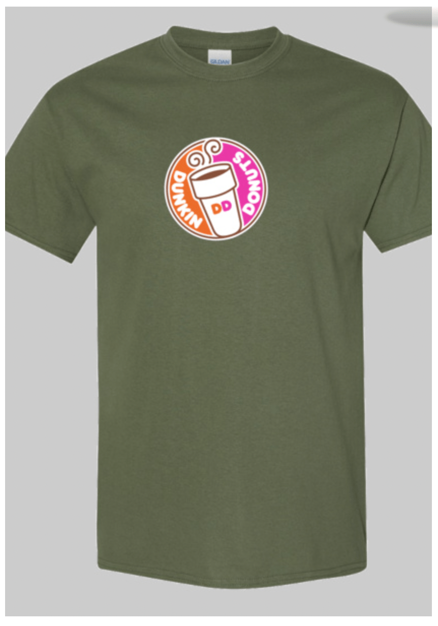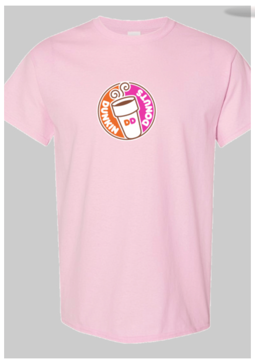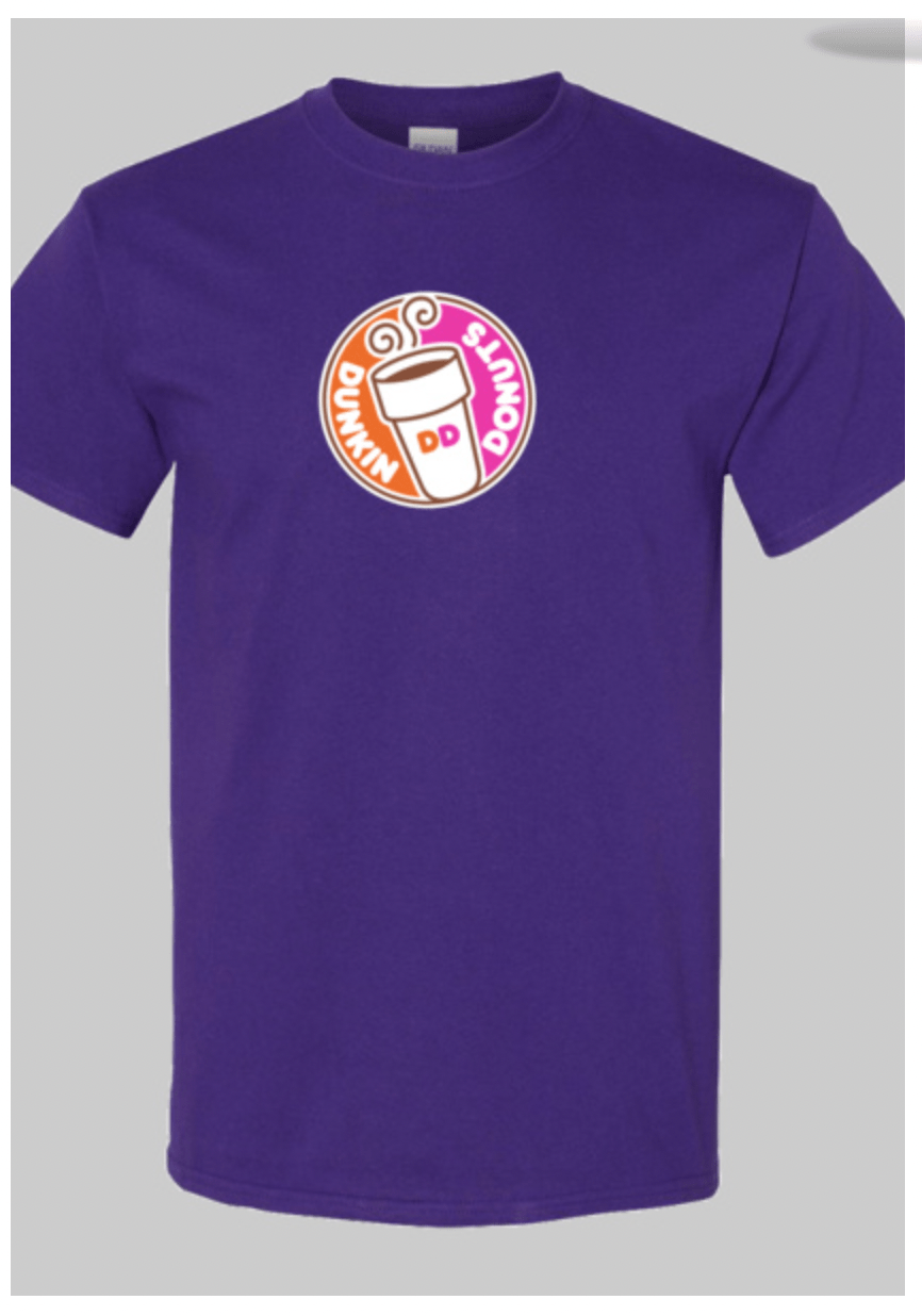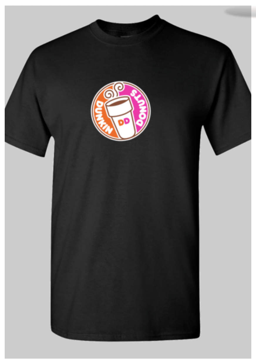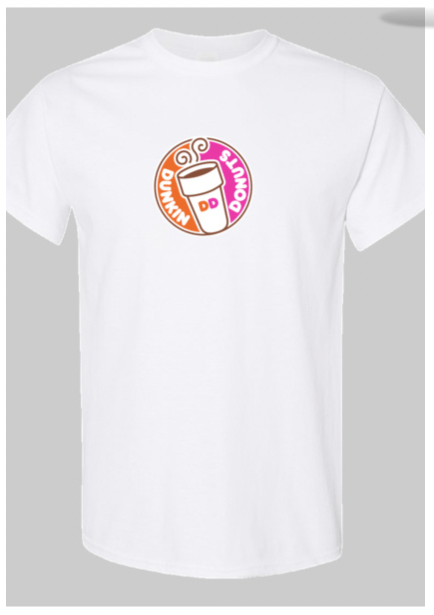 Cotton blend short sleeve classic fit t-shirt. Unisex sizing. Dunkin Donuts circle logo on center chest.